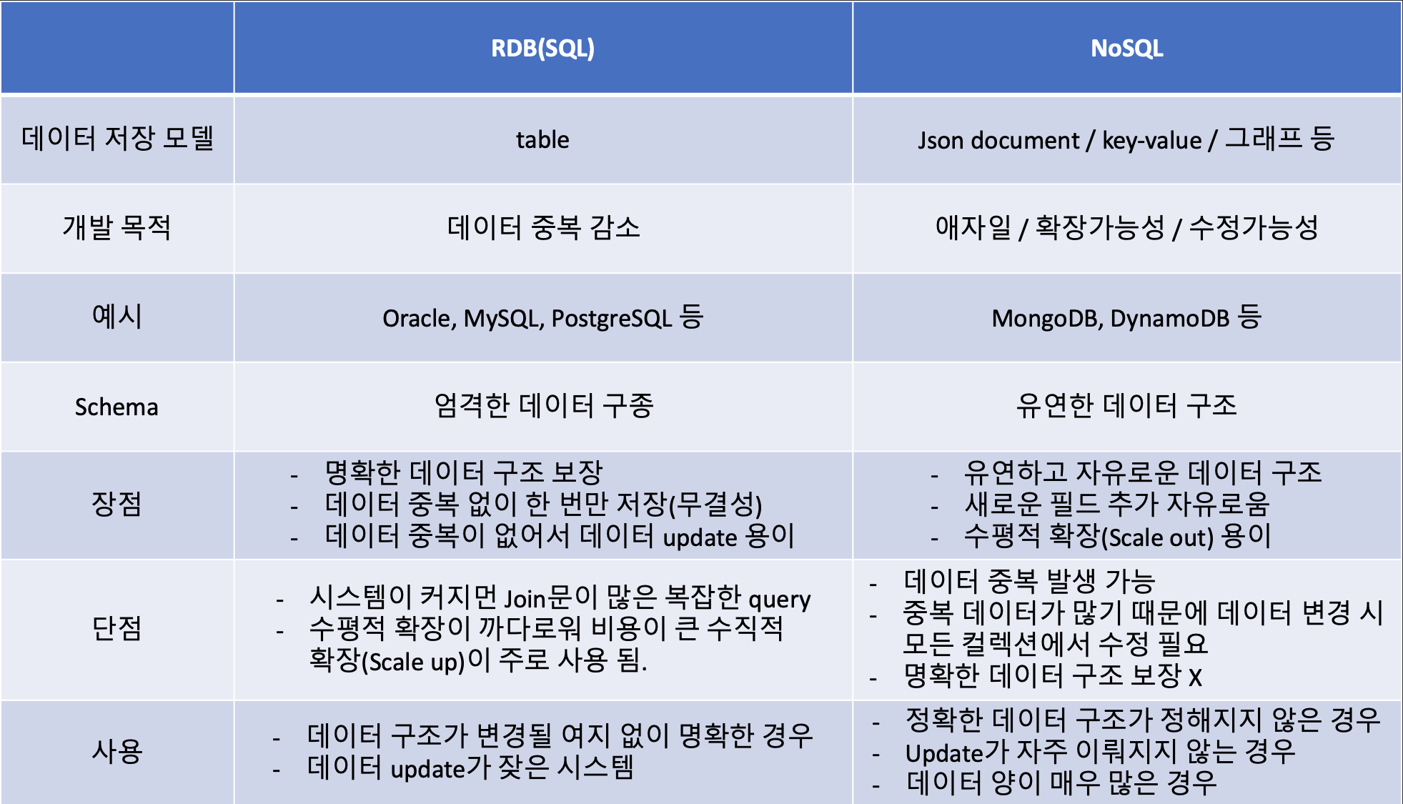 - RDB는 데이터 구조가 명확하여 변경될 여지가 없는 경우, 또 데이터 중복이 없으므로 데이터 update가 잦은 시스템에서 사용하면 좋다.