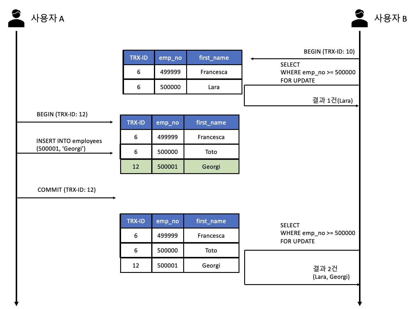 - 사용자 A의 트랜잭션 번호는 12이며, 사용자 B의 트랜잭션 번호는 10이다.