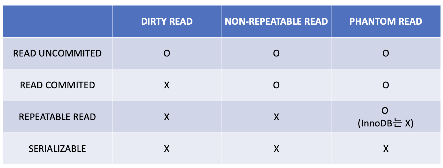 - 격리 수준은 READ UNCOMMITED, READ COMMITED, REPEATABLE READ, SERIALIZABLE의 4가지로 나뉜다.