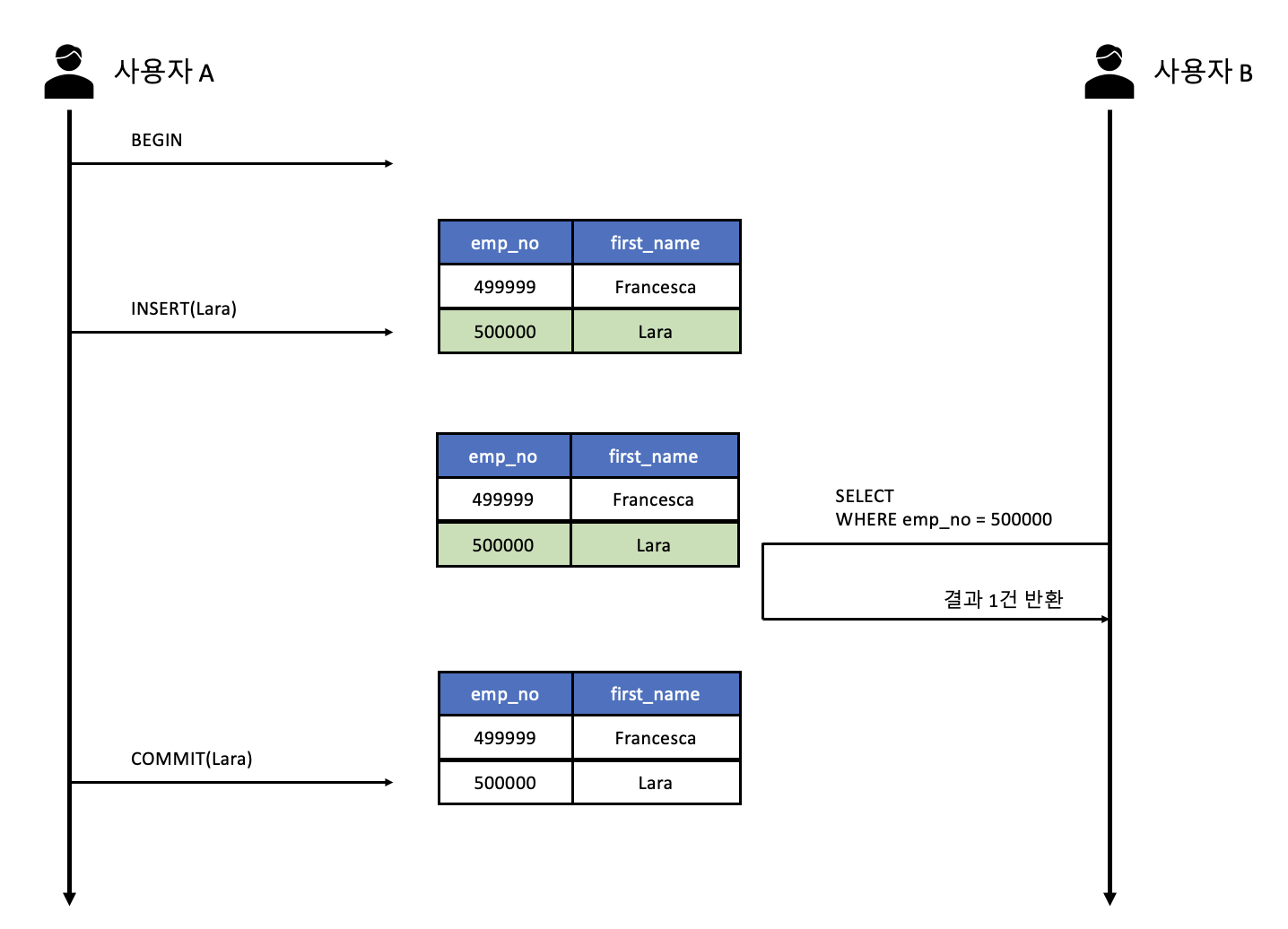- 사용자 B가 emp_no=500000인 사원을 A 트랜잭션의 변경 전후 각각 한 번씩 SELECT했는데 결과는 항상 "Lara"라는 값을 가져온다.