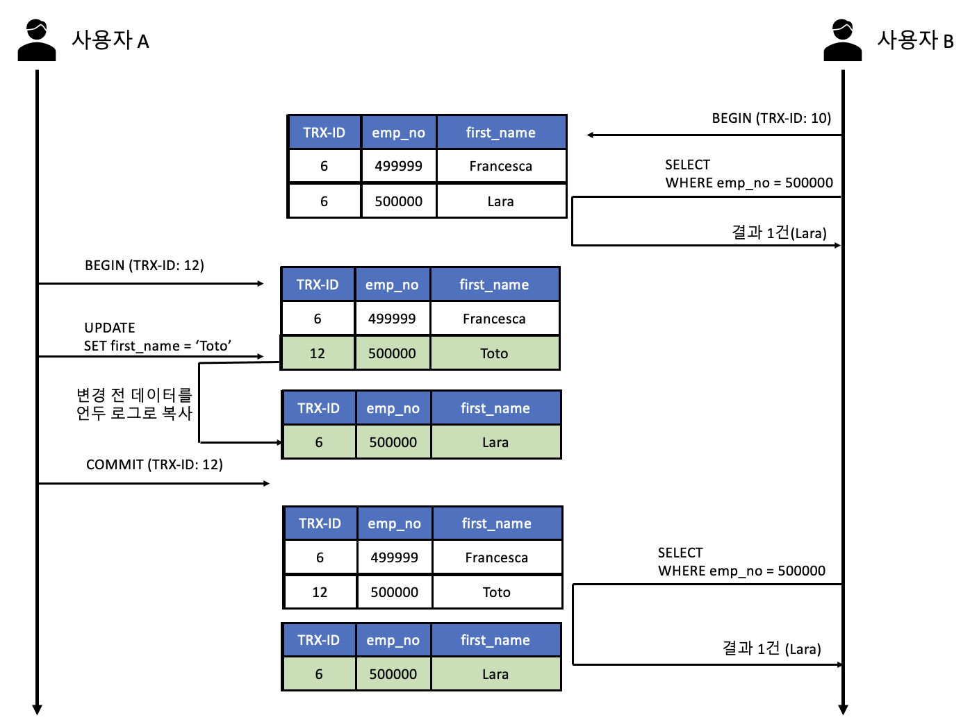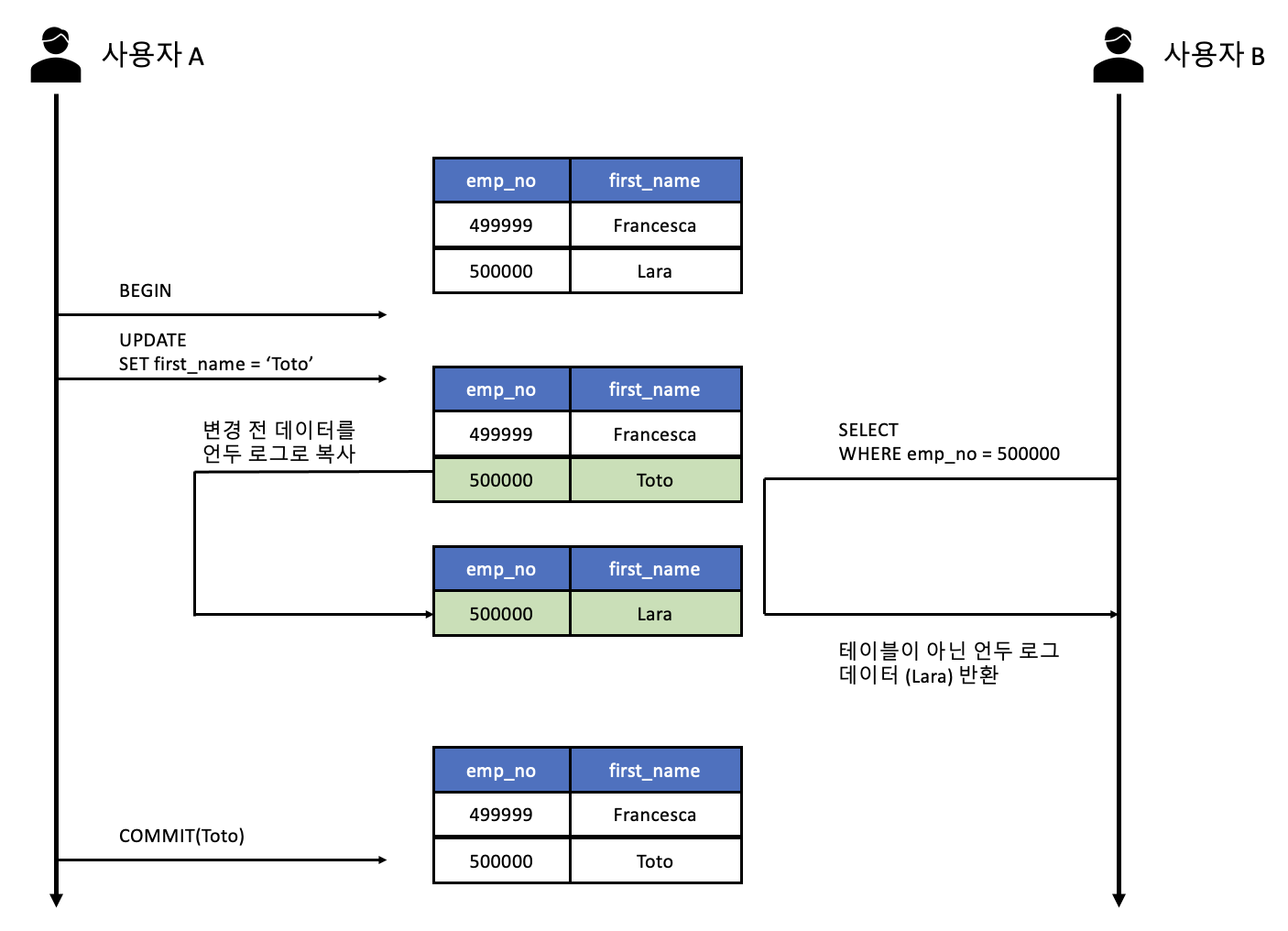 - 사용자 A는 emp_no=500000인 사원의 first_name을 "Lara"에서 "Toto"로 변경했는데, 이때 새로운 값인 "Toto"는 employees 테이블에 즉시 기록되고 이전 값인 "Lara"는 언두 영역으로 백업된다.