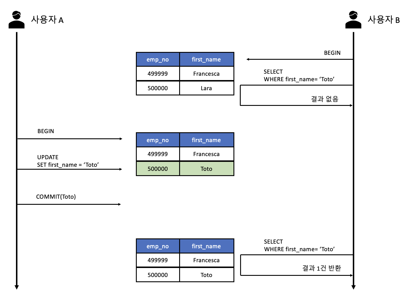 - 처음 사용자 B가 BEGIN 명령으로 트랜잭션을 시작하고 first_name인 "Toto"인 사용자를 검색했는데, 일치하는 결과가 없었다.