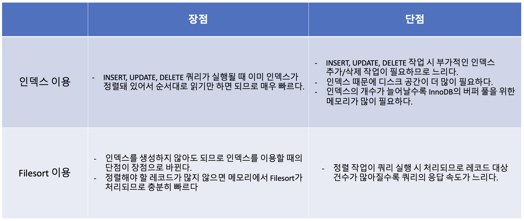 - 정렬 처리 방법으로는 인덱스를 이용하는 방법과 쿼리가 실행될 때 "Filesort"라는 별도의 처리를 이용하는 방법으로 나뉜다.