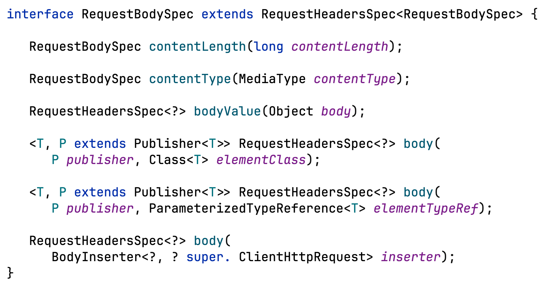 RequestBodySpec은 request의 body를 설정할 수 있는 메서드를 제공하며, publisher 또는 BodyInserter를 이용해서 변환할 수 있다.