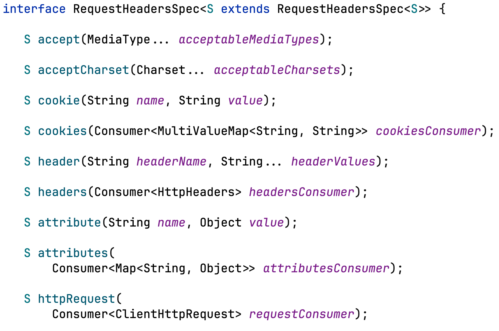 accept, acceptCharset: Accept 헤더 변경cookie, cookies: 요청의 쿠키 변경header, headers: 요청의 header 변경attribute: webClient의 filter들에 제공되는 attribute 설정httpRequest: HTTP 라이브러리의 요청에 직접 접근할 수 있게 callback 제공