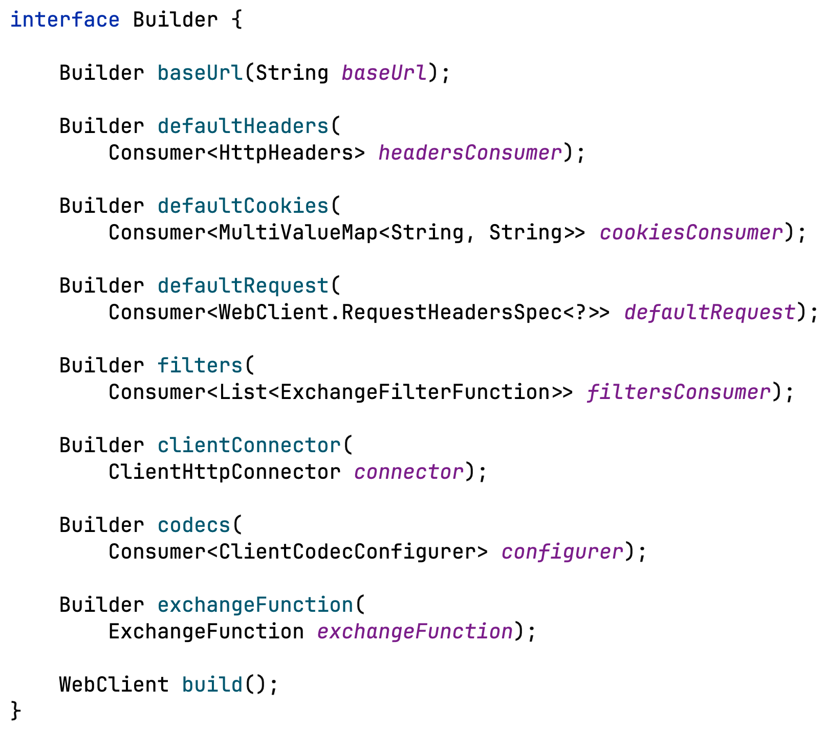 WebClientBuilder는 WebClient를 만들면서 필요한 설정들을 제공한다.