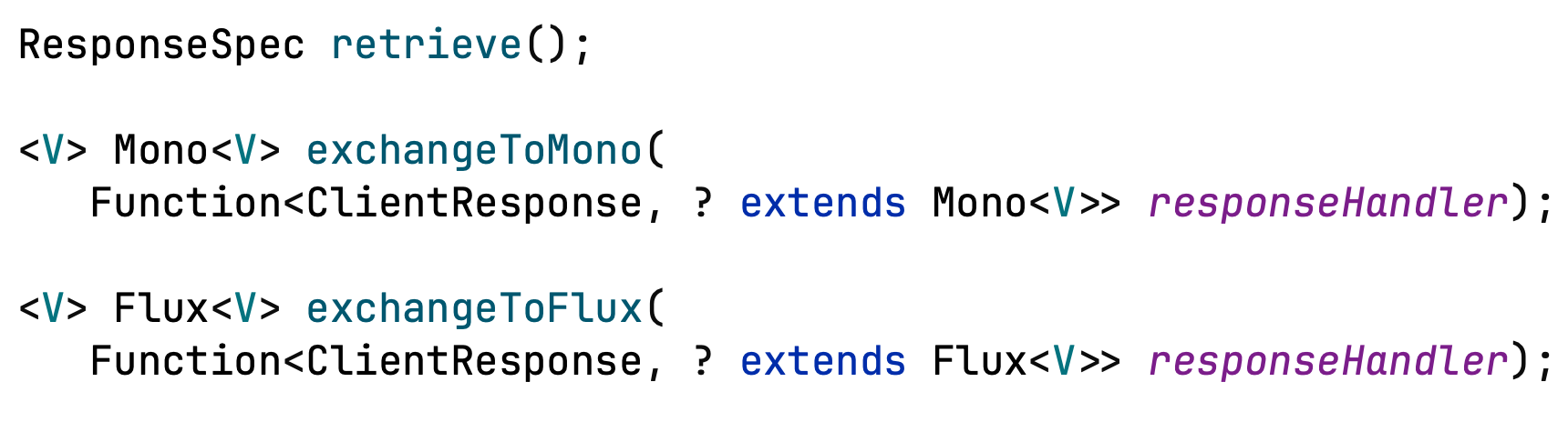 retrieve: ResponseSpec을 반환exchangeToMono: ClientResponse를 인자로 받고 body를 Mono형태로 반환하는 callbackexchangeToFlux: ClientResponse를 인자로 받고 body를 Flux형태로 반환하는 callback