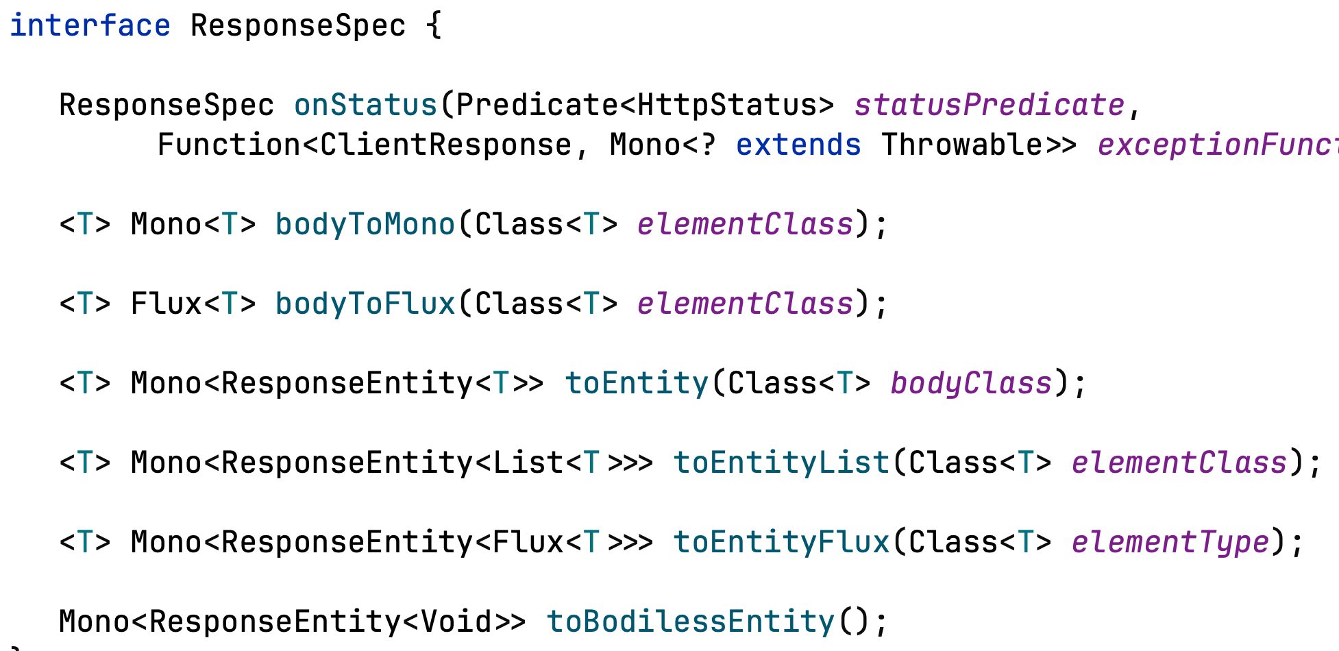 onStatus: response를 확인하고 문제가 발생 한 경우 Mono.error를 반환하여 error 전파bodyToMono, bodyToFlux: response를 mono나 flux로 변환toEntity, toEntityList, toEntityFlux: response를 ResponseEntity로 반환하고 각 각의 body를 하나의 객체 혹은 List나 Flux로 변환toBodiessEntity: response를 ResponseEntity로 변환하고 body는 포함하지 않는다