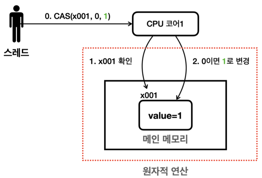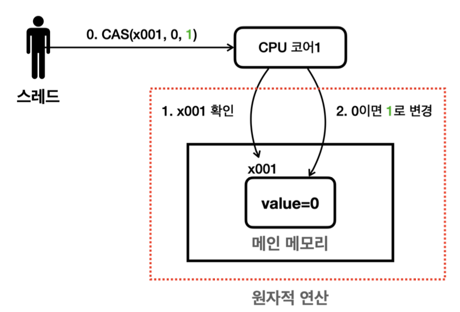 이 과정에서 충돌이 발생할 때마다 반복해서 다시 시도하므로, 결과적으로 락 없이 데이터를 안전하게 변경할 수 있습니다. CAS를 사용하는 방식은 충돌이 드물게 발생하는 환경에서는 락을 사용하지 않으므로 높은 성능을 발휘할 수 있습니다. 이는 락을 사용하는 방식과 비교했을 때, 스레드가 락을 획득하기 위해 대기하지 않기 때문에 대기 시간과 오버헤드가 줄어드는 장점이 있습니다.