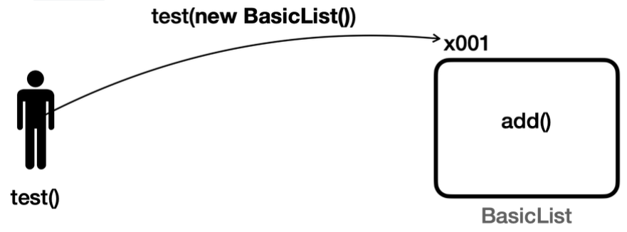 test(new BasicList())를 실행하면BasicList(x001)의 인스턴스가 만들어지면서test()메서드에 전달됩니다.test()메서드는BasicList(x001)인스턴스의 참조를 알고 사용하게 됩니다.