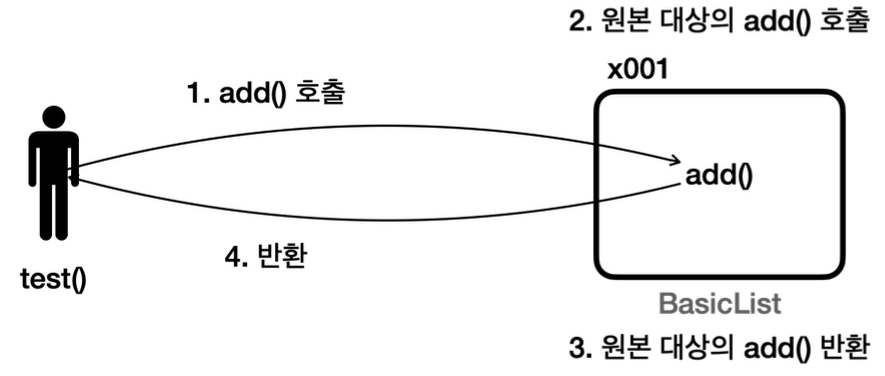 기존에 BasicList 를 직접 사용하고 있었다면, 이제 중간에 프록시를 사용하므로 다음과 같은 구조로 변경됩니다.